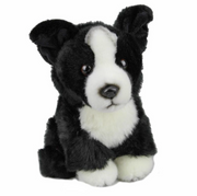 Super soft and cuddly black and white Border Collie Puppy dog soft plush toy in sitting position.