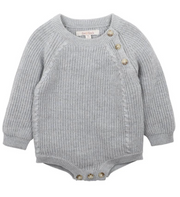 This gorgeous soft blue marl fisherman's rib knitted romper features a side front neck and crotch button opening and is a classic piece for your little one's winter wardrobe.