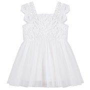 The Angie Lace Romper is the most gorgeous romper for your bub! Featuring a beautiful lace bodice and shoulder trim, soft tulle skirt, snap closure at gusset, back button closure, cotton lining, complimented by a matching ribbon at back. Ideal for your baby's next wedding, christening, birthday party or special occasion!