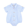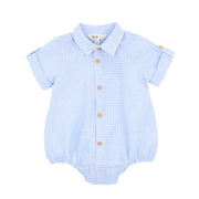 A timeless classic with a playful twist, this soft cotton check bodysuit is perfect for sunny days and special outings alike. The lightweight gingham fabric keeps little ones cool and comfy, while smart shirt styling—including a collar, front buttons and rolled sleeve tabs—adds a dressed-up touch. Elasticated leg openings and concealed crotch press studs make changes easy, without compromising on charm.